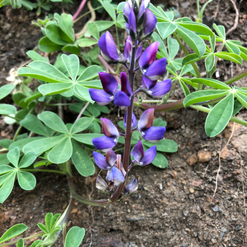 Arroyo Lupine is an annual herb, which grows up to a meter in height. The plant’s characteristic lupine leaves are palmately compounded with 7 to 9 leaflets. Each dark green leaflet is up to 6 cm long and is smooth. On the fleshy stems grow erect, loose whorls of flowers, generally a purplish-blue in color with white or pink banner patches. The hairy legume pod is up to 5 cm long and 1 cm wide.