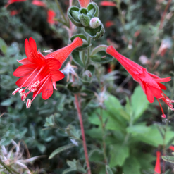 California Fuchsia is a brilliant flowering perennial, notable for its profusion of bright scarlet flowers. This low-lying plant has long, woody tendrils stretching from its base, covered in leaves. The pointed, ovate leaves range in color from light green to silvery white and in shape from lacy on the stalk to wide near the base. The inflorescence blooms at the end of the stalks in clusters of vivid red, trumpet-like flowers.